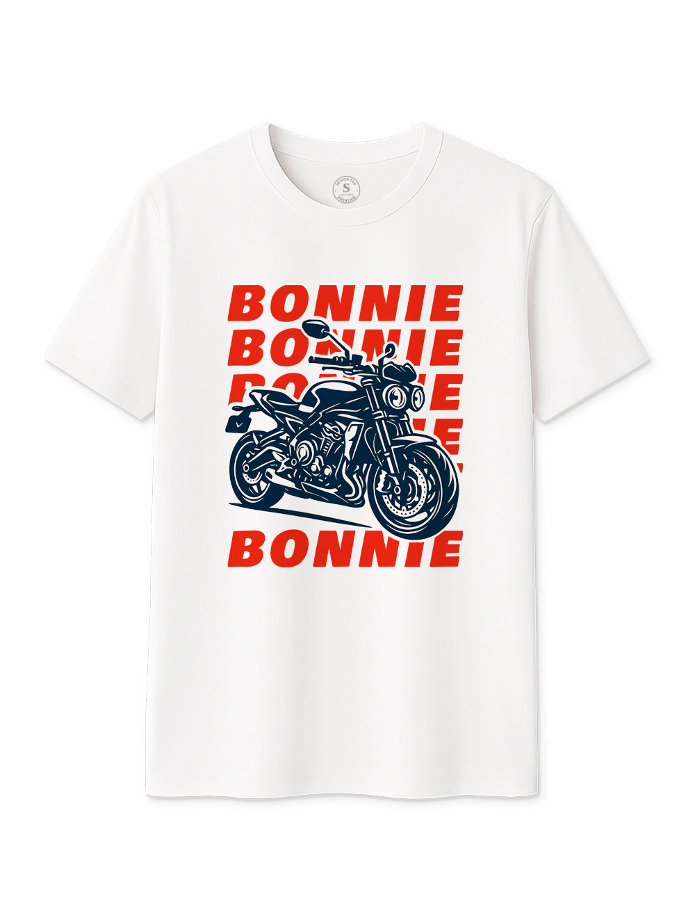 Prepárate para sentir el asfalto en el pecho. Esta camiseta original grita velocidad, potencia y estilo con cada letra de BONNIE estampada. Inspirada en la icónica Triumph Street Triple RS, este diseño repite su nombre como si fueran revoluciones subiendo sin freno.