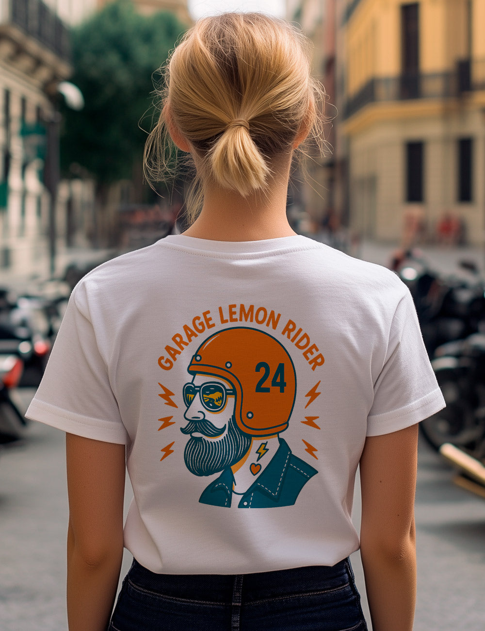 GARAGE 24 es la prenda que grita gasolina, actitud y estilo desde cada costura. En la espalda, un biker ilustrado en estilo vintage con su barba bien marcada y su casco naranja brillante te invita a recorrer las calles con alma rebelde. Y en el pecho, un pequeño casco con el número 24 bajo la palabra GARAGE da ese toque minimal pero con carácter.