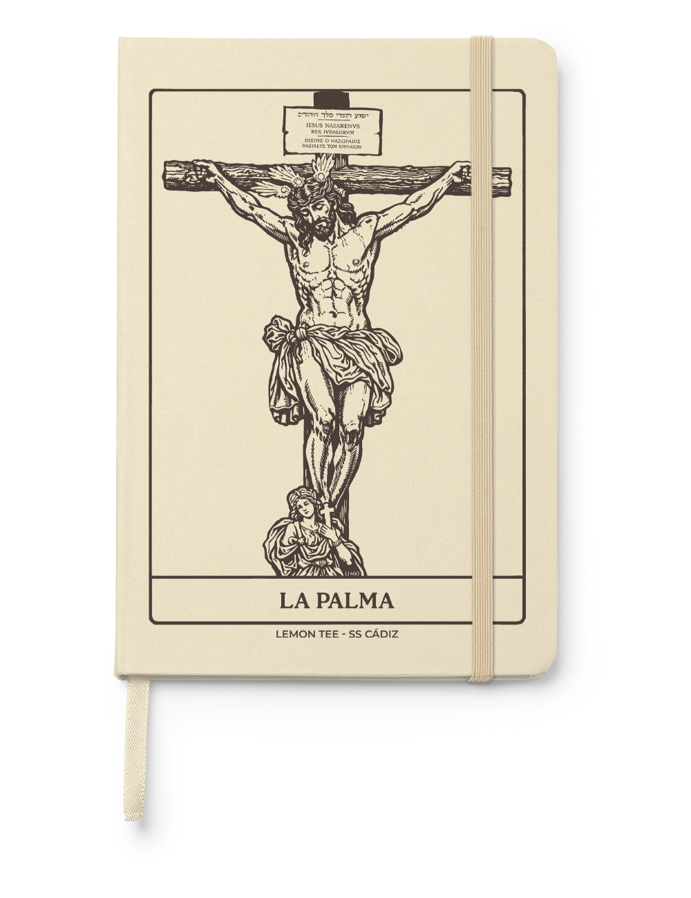 Este cuaderno A5 con tapa dura está inspirado en La Palma, una de las imágenes más sobrias, antiguas y profundamente veneradas de la Semana Santa de Cádiz. Su portada muestra a Cristo crucificado en una representación directa y esencial, donde la figura de Jesús se eleva en silencio, con una fuerza serena que invita a la contemplación y al recogimiento interior. A sus pies, la presencia simbólica añade un matiz de humanidad y consuelo al conjunto.