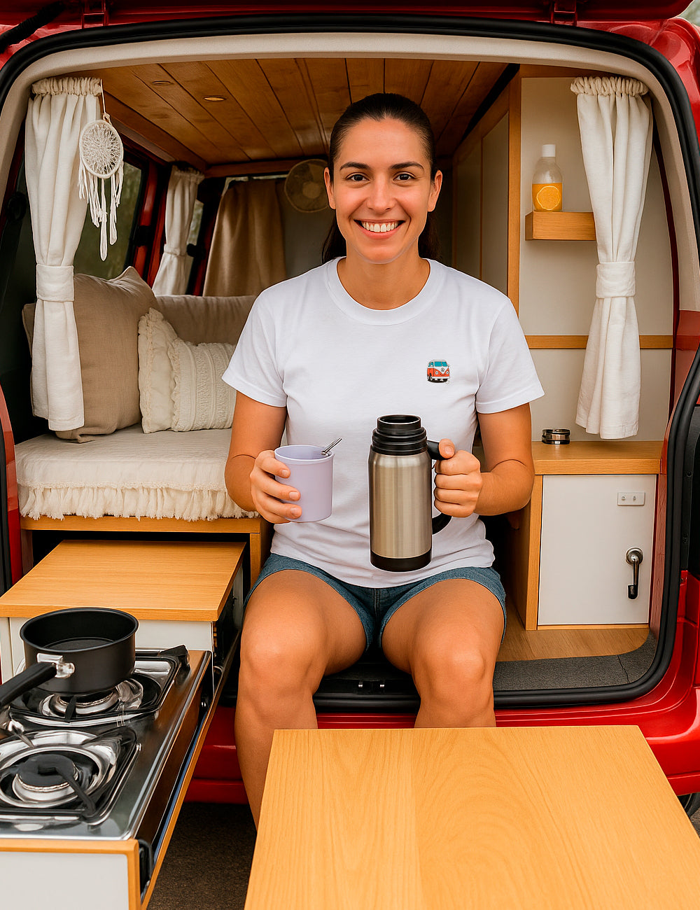 La parte frontal lleva un mini estampado de la mítica furgoneta con alma hippie, y en la espalda un diseño grande y colorido que grita “nos vamos de ruta”.