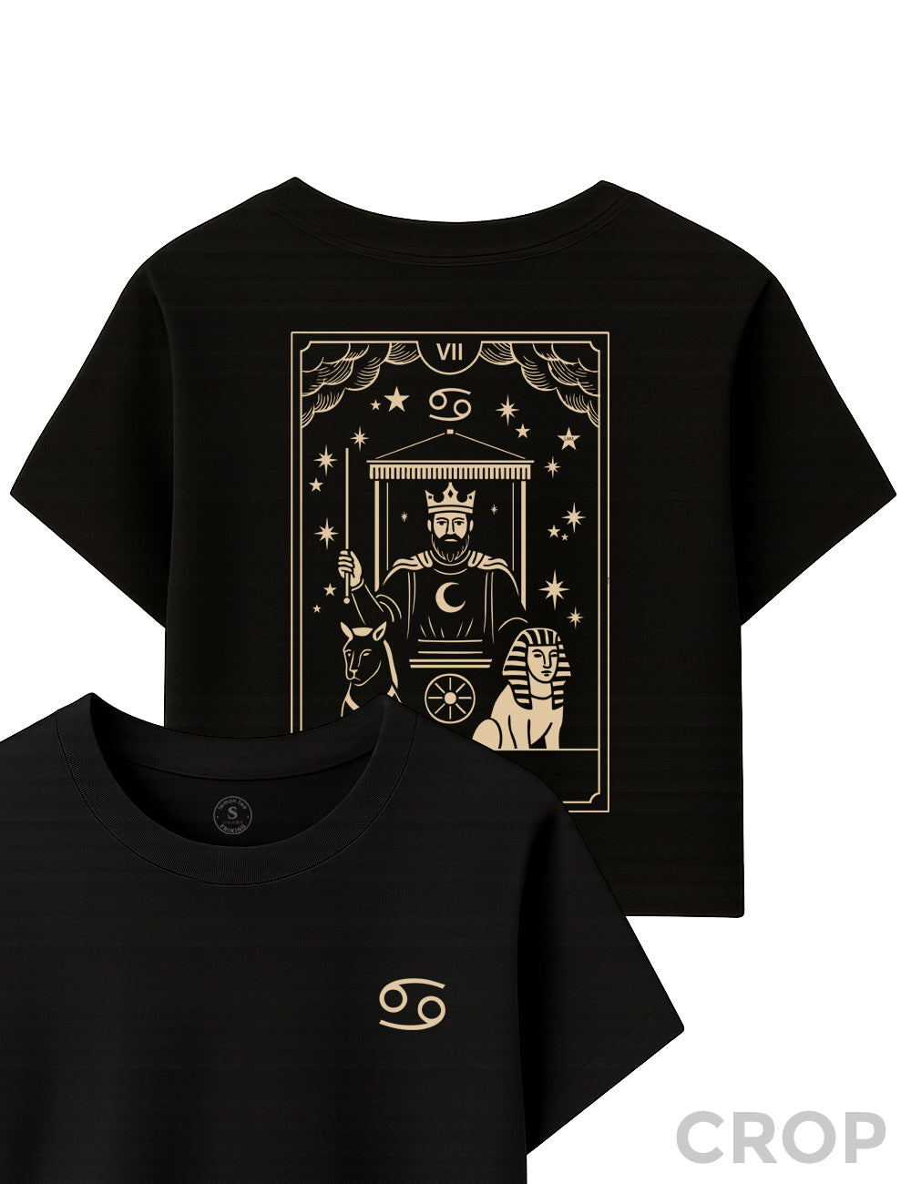 Esta camiseta negra combina ternura y autoridad como solo este signo sabe hacerlo: símbolo frontal minimalista y en la espalda el Carro del tarot, representando la determinación, la protección y ese viaje emocional del que Cáncer siempre sale más sabio (y más guapo).