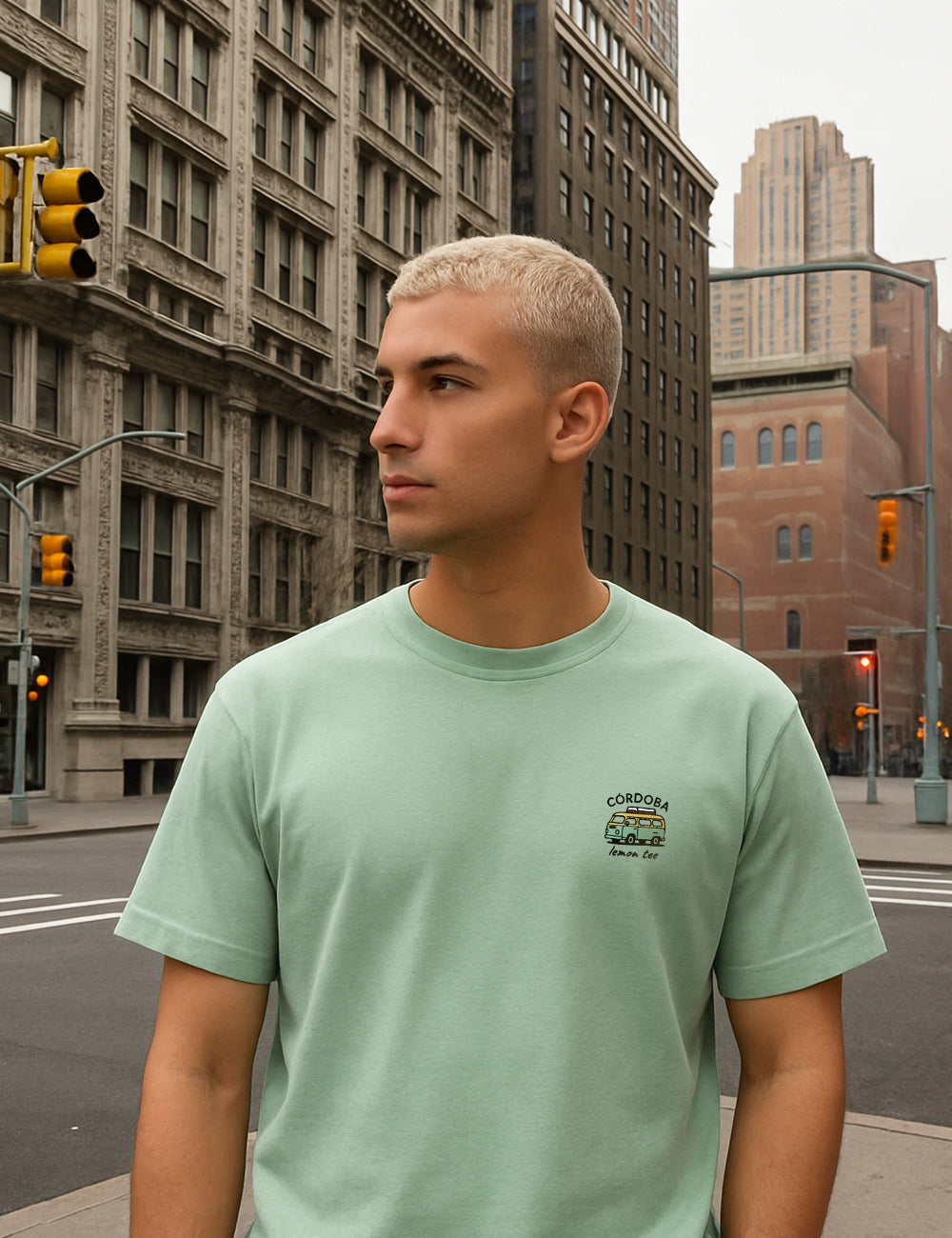 En primer plano, la ya icónica furgoneta vintage recorre el camino, simbolizando ese espíritu viajero y libre que caracteriza la colección. El mensaje “Córdoba is calling and I must go” completa el diseño, reflejando esa llamada irresistible de la ciudad.