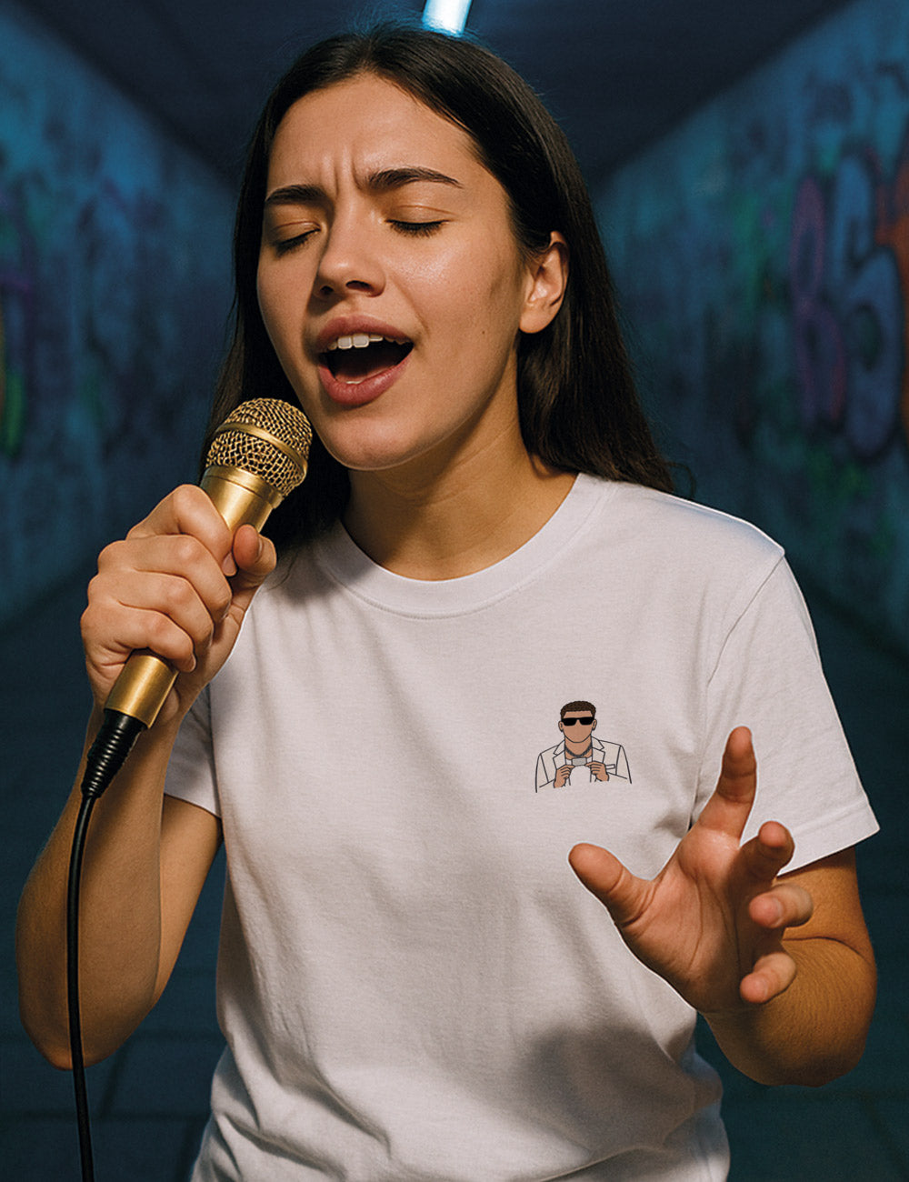 Esta camiseta no canta, pero casi. Minimalista y directa al pecho, el diseño captura al Quevedo más icónico: gafas oscuras, micro en mano y ese flow que ya es marca nacional. No necesita nombre. Quien sabe, sabe.