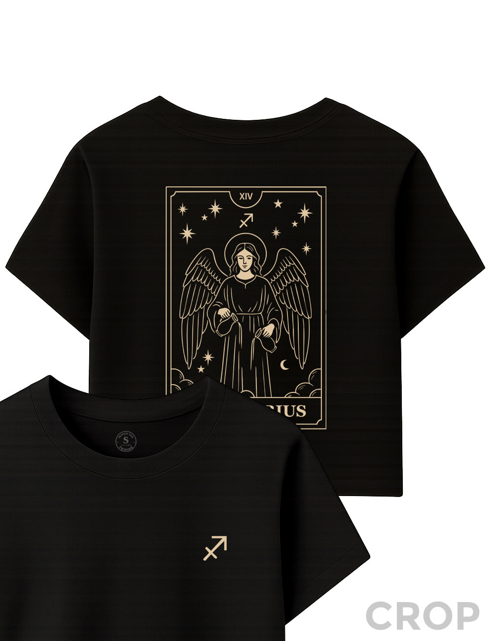 En la parte delantera, el símbolo de Sagitario: sencillo, limpio y directo al grano… como tú cuando sueltas verdades sin anestesia. Pero ojo, ¡la magia está detrás! La carta XIV del tarot cobra vida con un ángel sereno y poderoso, rodeado de estrellas y equilibrio cósmico, ese que tú finges tener mientras decides tu próximo destino sin mirar atrás.