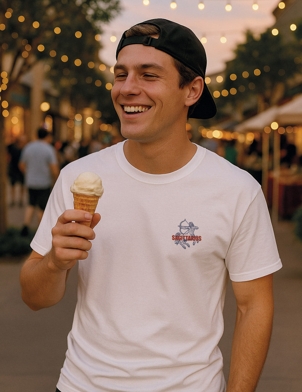 Sagitario es esa fuerza indomable que nunca se conforma, siempre buscando nuevos horizontes y aventuras sin límites. En esta camiseta, un arquero centauro —firme y decidido— apunta su flecha hacia el infinito, simbolizando tu espíritu libre y tu hambre insaciable de explorar lo desconocido.