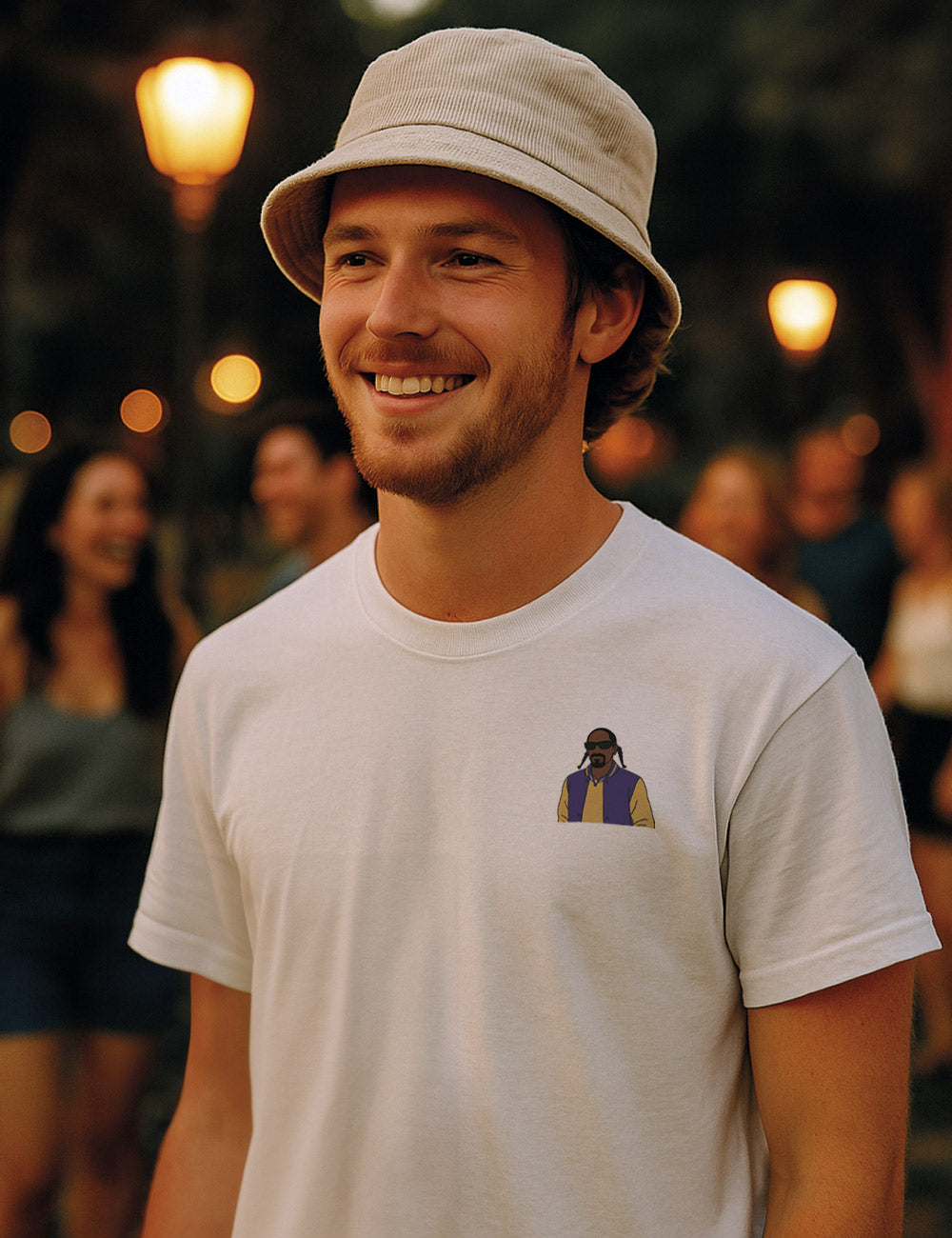 ¿Fan del flow eterno de Snoop Dogg? Esta camiseta es un tributazo en toda regla. Nuestro querido fan se planta su mejor outfit con trenzas, gafas oscuras y chaleco al estilo más puro del Doggfather, logrando un parecido que es casi más Snoop que el propio Snoop (sin infringir, claro 😎).