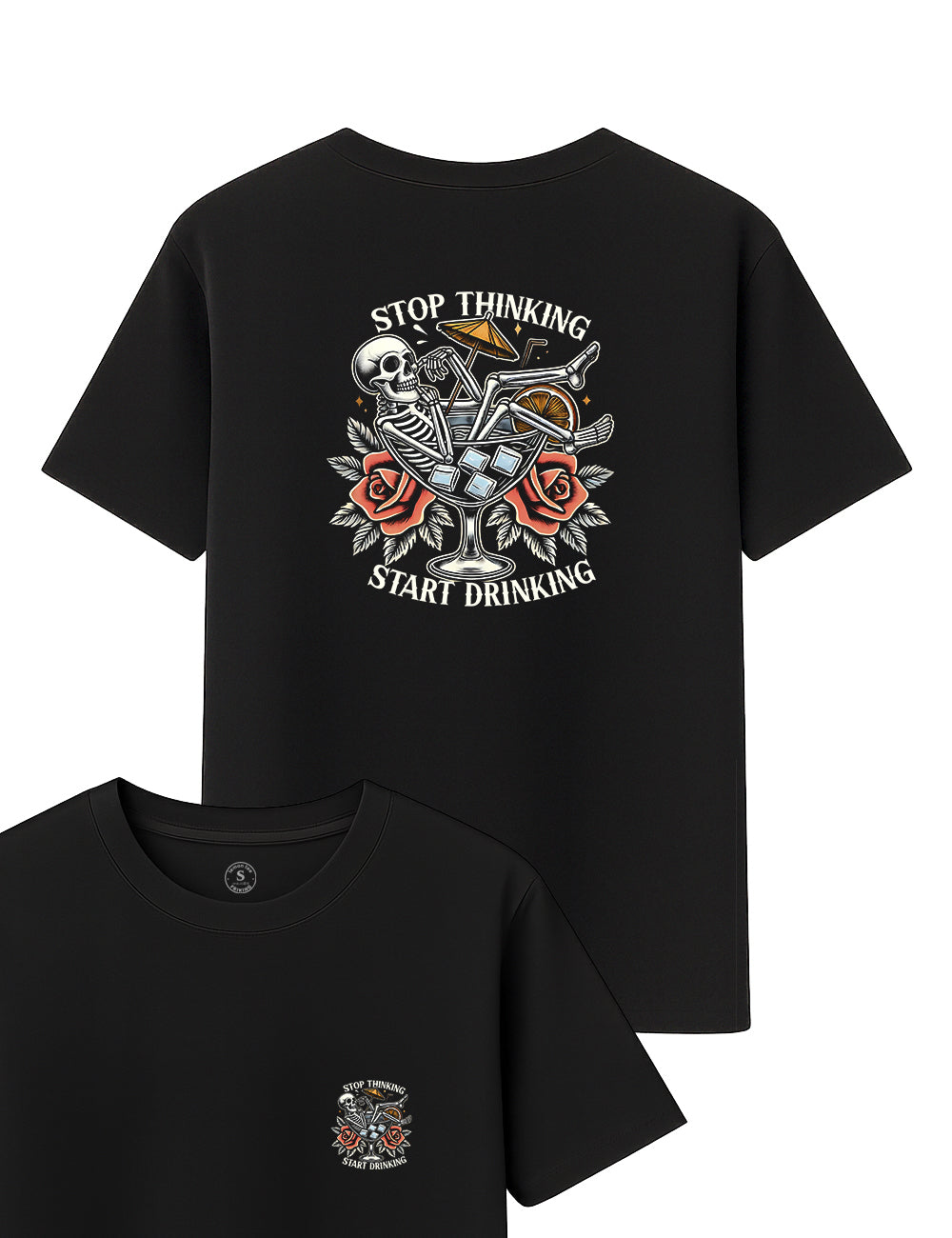 ¿Estás cansado de pensar? ¡Únete al club con esta camiseta original de Lemon Tee! Inspirada en el arte old school tattoo, esta prenda muestra un esqueleto relajado y bien acompañado, rodeado de hielos, flores y un trago para los días de "cero preocupaciones". Con un estilo que grita rebeldía, esta camiseta lleva el mensaje "Stop Thinking, Start Drinking" y es perfecta para quienes quieren tomarse la vida con un sorbo de humor.