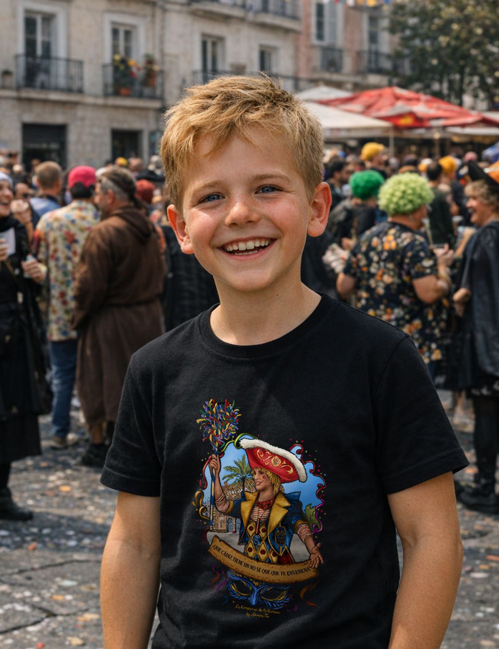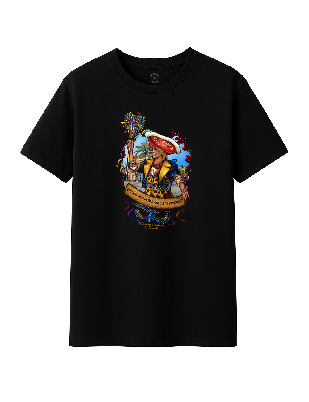 Esta camiseta es puro veneno del bueno. Un diseño lleno de color y picardía que rinde homenaje al espíritu más callejero y libre del Carnaval de Cádiz. Un personaje que alza su ramo como quien lanza coplas al aire, con la sonrisa del que sabe que aquí el arte se canta y se vive sin permiso. 🎶✨
